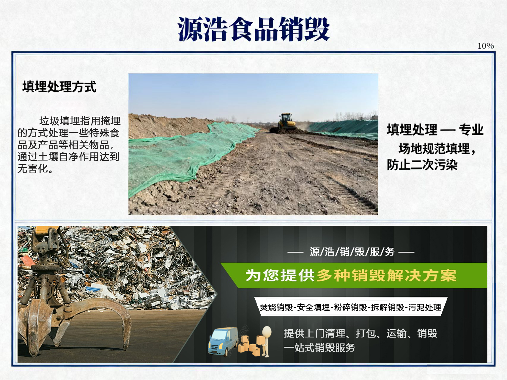 广州源浩食品产品销毁公司,食品报废销毁,公司拥有专业运输车辆、搬运团队,具备安全、可靠、成熟的销毁方案。如贵公司有产品需要报废销毁处理,那就联系我们吧,我们将用行动结果给您满意的答复。 以下为大家介绍过期、变质食品,生活垃圾、一般固体废弃物处理方的三种方法:填埋处置、焚烧处置、填埋处理。